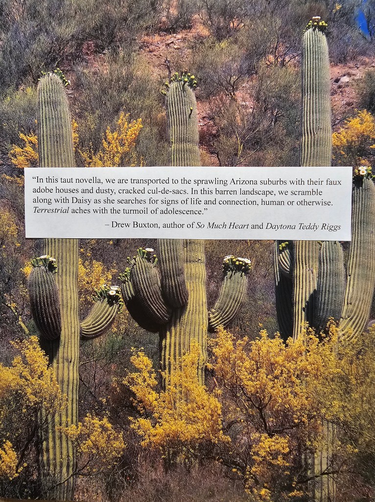“In this taut novella, we are transported to the sprawling Arizona suburbs with their faux adobe houses and dusty, cracked cul-de-sacs. In this barren landscape, we scramble along with Daisy as she searches for signs of life and connection, human or otherwise. TERRESTRIAL aches with the turmoil of adolescence.” – Drew Buxton, author of So Much Heart and Daytona Teddy Riggs