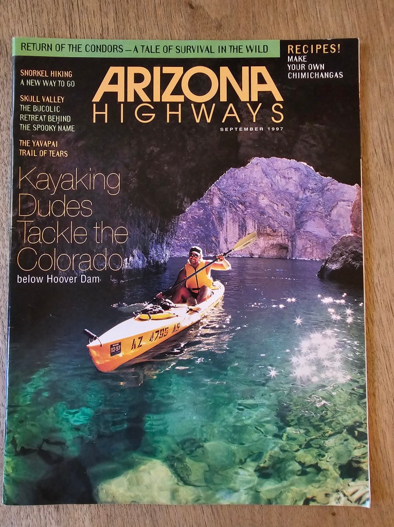 I wanted to create photos with the blurb text over them. It’s funny how in recent years I’ve gone from feeling on top of technology to feeling disconnected and aged, and really, unwilling to learn. I don’t know how to make videos and struggled with canva so I deleted it. I tried to paste the words over my own photos using an editing program on my computer but was frustrated with how it looked, my inability to move the text around correctly. So, I went old school and found some copies of Arizona Highways from 1997 (approximately when the book is set), picked photographs that looked most like the desert of the Phoenix area that I’m used to and where Terrestrial maybe takes place, and printed the text on my printer at home before cutting it out and laying it over the pages.